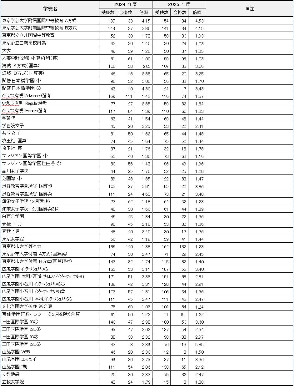 入試の難易度は、まずは入試科目およびその入試科目の問題自体のレベルもありますが、実質倍率も大きく影響します。以下は、2025年度帰国枠入試において受験者の多かった学校(一部を除き40名以上)について合格者数と倍率、同じ項目について2024年度入試結果を一覧にしてあります。